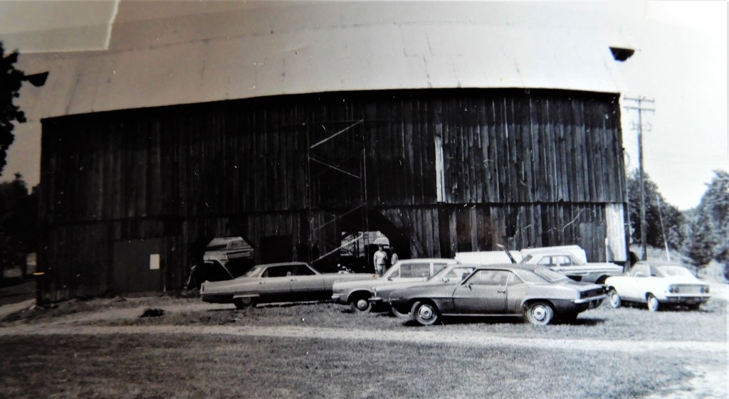 Very early in the barn remodeling.  It’s hard to see, but scaffolding is erected and most of the missing barn siding has been replaced. 1972