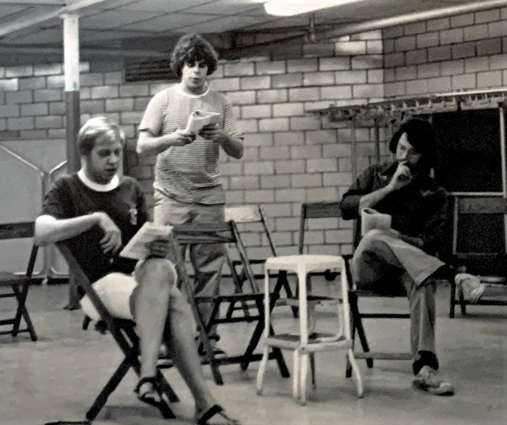 Unknown actor, T.C. (Tom Cervone), and Larry Crofford rehearsing Arsenic