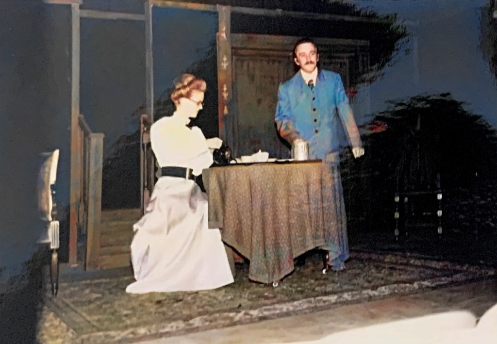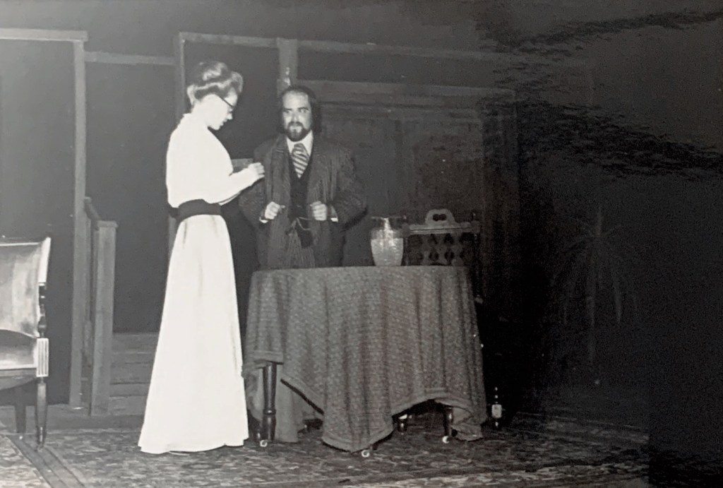 There was a gaslight chandelier and gaslight sconces flanking the fireplace.  More gaslights were on the landing, in the hall outside the arch, and on the wall behind the piano. It was a lovely set—dark, brooding, and so perfect. Every day with a performance, one of the staff would polish (not just dust) the furniture and vacuum the rug!  The furniture, chandelier, sconces, rug, and andirons came from my Aunt Alice and Uncle Bob’s garage. Our crew had moved the furniture from their basement to the garage out of harm’s way during the 1972 flood. Now some of the lovely pieces we had saved were gracing our stage.