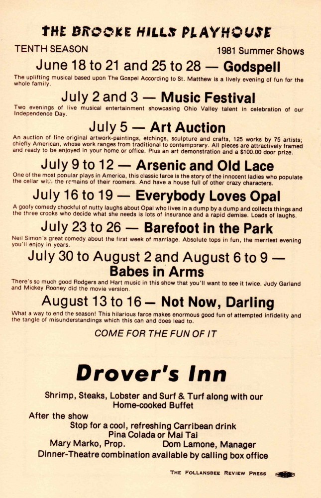 “I’m sure it was Jim and Kathy who told me about Brooke Hills Playhouse,” he said. “And it was probably Jim who suggested I audition when Arsenic and Old Lace was scheduled for production in the 1981 season. During that round of auditions, I was cast as Jonathan Brewster in Arsenic and Old Lace. Later, at the second set of auditions, I was cast in Everybody Loves Opal and GASP! A MUSICAL! Babes in Arms. I knew my limitations, and singing was now one of them, but I was happy to be onstage and flattered to be asked (and I’m sure they needed another body), so I took the part.”