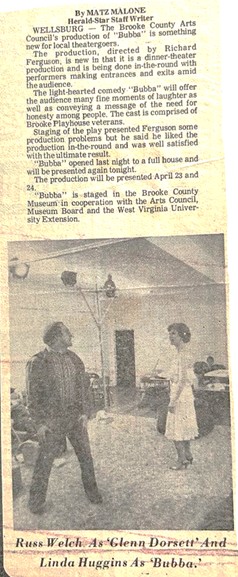 Anyway, a cute little 4-character comedy titled Bubba was selected for production. We asked high school student Mary Freshwater to handle publicity, and audition announcements (I think this was the first time we used our new title, Brooke County Arts Council) were sent out in February as the remodeling progressed. Richard Ferguson from St. Clairsville, Ohio, one of our most prolific actors and occasional directors, was chosen to direct the show.