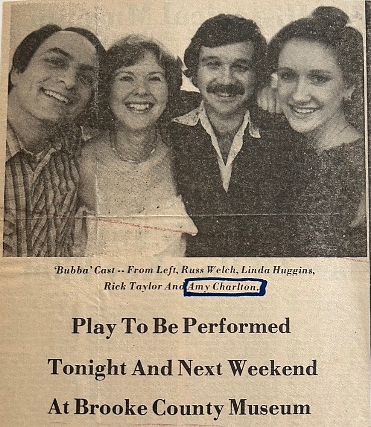 “In the spring of 1982, I helped with the renovation of the upstairs of the Brooke County Museum for the first Dinner-Theater there. I was asked to write the press release for Bubba, which was a new experience for me, but, since my sister Judy had done publicity for the Playhouse in the 1970s, I figured that I would be able to do it. I knew I had English teachers all around me, so I wasn’t going to be flying solo! I distinctly remember adding the word auspices to my vocabulary while writing that first press release. I’m not sure whether you, Shari, or Norma suggested it, but it has stuck in my mind forever as a great moment in vocabulary expansion! “I wrote, ‘The Brooke Hills Playhouse and the Brooke County Historical Society, under the auspices of the Brooke County Arts Council, will present the delightful comedy, Bubba…’”