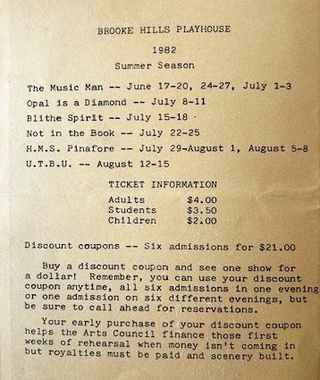 Bubba was a huge success. We never dreamed that one little comedy could save the Playhouse, but it did! We netted $3200(!), and we knew we’d have enough money to open the Playhouse for the 1982 season. While all the activity was happening, we were also reading scripts and hoping for a Playhouse season. We also realized that the Museum was a potential gold mine, so once the Playhouse season opened, we started looking for another show to do at the Museum in the fall.