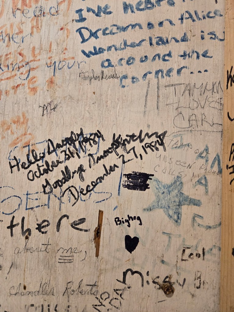“One of the first things I did when I got to the barn was check out the graffiti in the backstage restroom, and I found one of my contributions, ‘Hello, Snoopy, June ’84. Goodbye, Snoopy, Dec. ’84.’  [NOTE FROM SHARI: How many Playhouse alums rush to check out the backstage restroom graffiti when they return to the barn? A hell of a lot! It cracks me up that Ron even took a photo!]