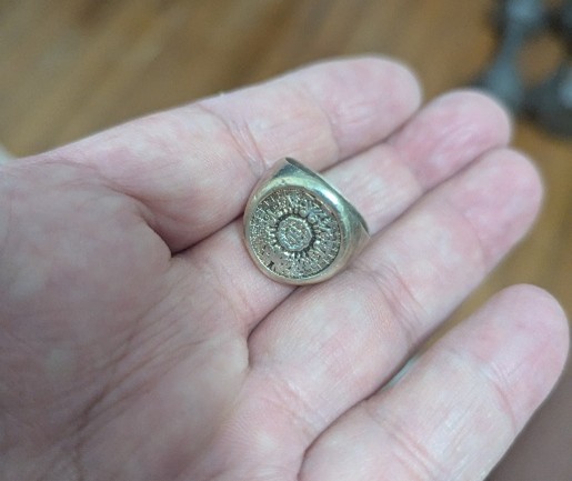 “I remember at one cast party, Susan Price [NOTE: probably the Blythe Spirit cast party], who worked for an airline but also sold jewelry, brought some jewelry to the party and gave us all a piece. I received one of two silver Aztec calendar rings that she had with her. I had that ring for years, but eventually it was lost. I called Susan to see if she still had the other one, but she didn’t. Twelve years later, my little brother John was in an East Liverpool bar when, for some reason, the bartender, who was talking to the guy beside John, reached behind him and brought out a jar with all kinds of goofy lost stuff. He poured it out on the bar, and John saw my ring! My ex-wife had lost it! I got it back, and I still have it!