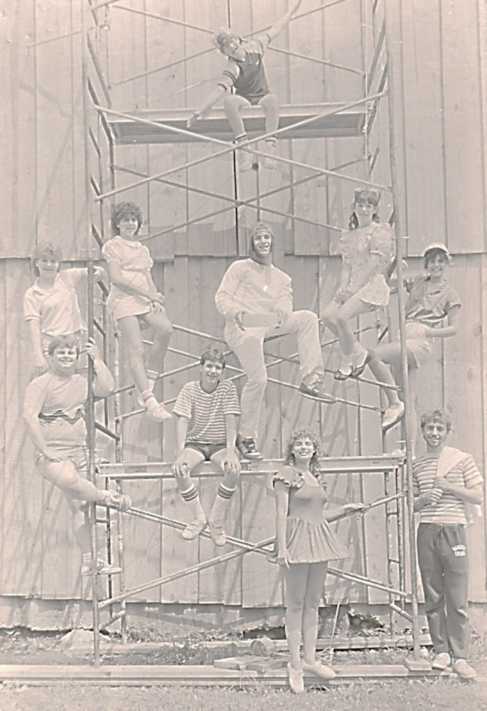 “Later that summer, I was cast in one of my favorite shows, Snoopy. I played Charlie Brown.  Before Snoopy opened, Shari positioned the cast members for a publicity photo on the large scaffold that was being used to re-side the barn that summer.