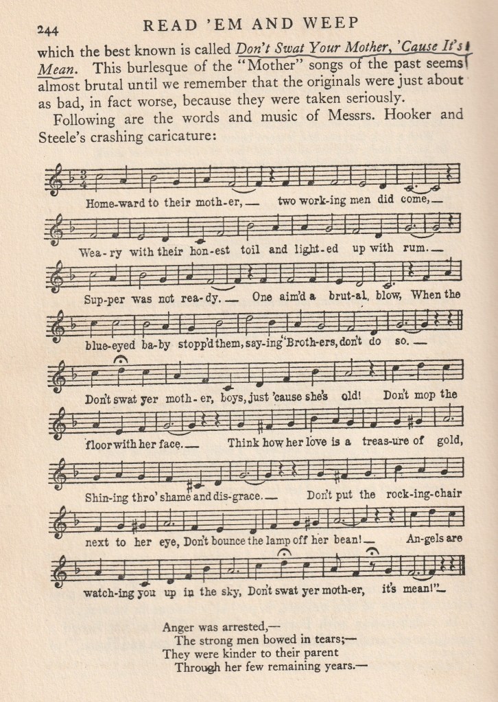 Around the cast party campfires, he would sing great old songs like “Don’t Swat Your Mother, Boys” and “Heaven Will Protect the Working Girl.” We couldn’t get enough of those songs which he’d sing so sincerely and innocently. He’d have us in stitches. I wish I could remember the titles of more of his songs. Here are the two he sang most often and which I found in a book titled Read ‘Em and Weep, the Songs You Forgot to Remember ©1926 by Sigmund Spaeth. I’m sure some of you will remember Al singing them.